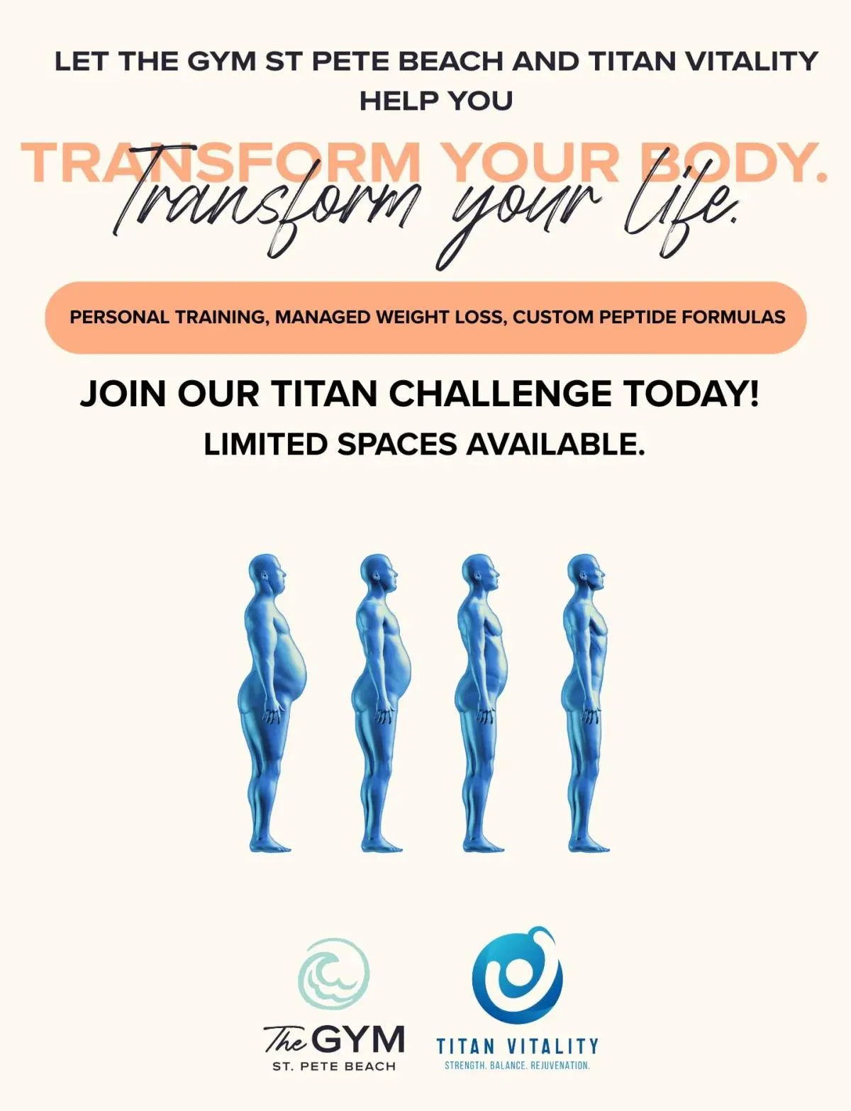 Get ready to commit to a 3 month total body recalibration built around THE GYM ST. PETE BEACH and TITAN VITALITY’S most powerful tools for composition change, hormonal harmony, and performance optimization.
